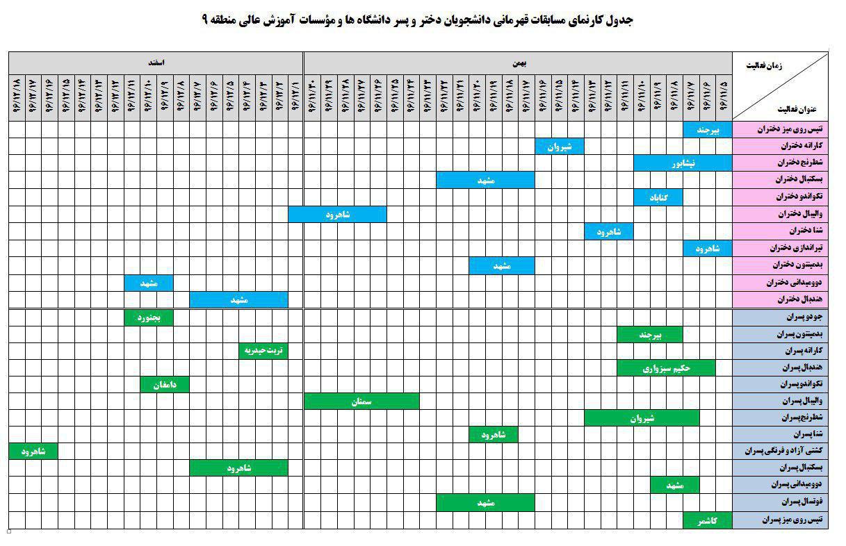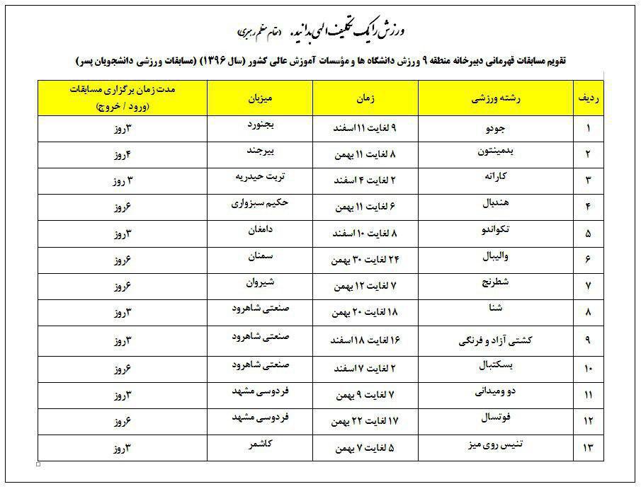 احتراما پیرو نشست مدیران تربیت بدنی دانشگاه ها و موسسات آموزش عالی منطقه 9 کشور، تقویم مسابقات ورزشی منطقه (انتخابی المپیاد ملی 1397) به همراه آئین نامه های فنی مسابقات در ذیل ارائه می گردد.
