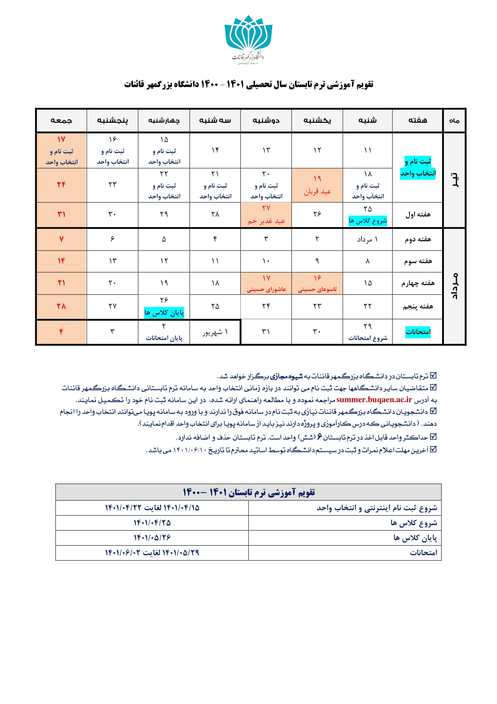 - حداکثر واحد قابل اخذ در ترم تابستان 6 واحد است. ترم تابستان حذف و اضافه و حذف اضطراری ندارد.